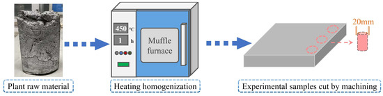 The raw material investigated in this study is hot-dip galvanizing surface slag acquired from China Baowu Iron & Steel Co. Ltd. (Wuhan, China). To ensure uniform composition, the raw material is melted in a muffle furnace with proper stirring and then cooled in the furnace. For the subsequent supergravity separation test, the raw material was processed into 20 mm diameter samples using wire-electrode cutting, as depicted in Figure 1. Table 1 illustrates the chemical composition of the hot-dip galvanizing slag, where the oxygen content in the raw material is insignificant and therefore disregarded. The contents of the other three principal elements, namely Zn, Al, and Fe, are normalized. Zn is the primary component with a content of 91.84 wt%, followed by Al and Fe with a content of 7.68 wt% and 0.48 wt%, respectively.
