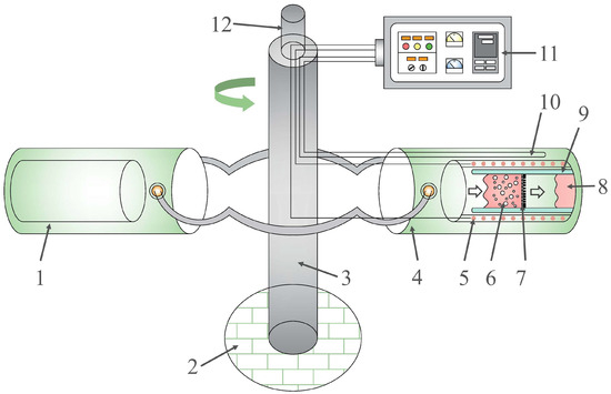 Schematic and physical diagrams of the centrifugal apparatus are shown in Figure 2, with a resistance heating furnace and counterweights symmetrically fixed on the horizontal rotor. This apparatus has several advantages, such as small volume, wide applicability, convenient operation and maintenance, and low energy consumption. It has two centrifugal tanks, with one used to heat and centrifuge the sample (separation tank) and the other used to balance the equipment and maintain the centrifugal process’s stability (counterweight tank). The resistance furnace is composed of Cr27Al7Mo2 resistance wire for heating and alumina fiber used as the insulating layer. The counterweight tank must have the same weight and center of gravity as the separation tank. The temperature is controlled by a programmed controller with a B-type thermocouple, and the observation accuracy range is ±3 °C.