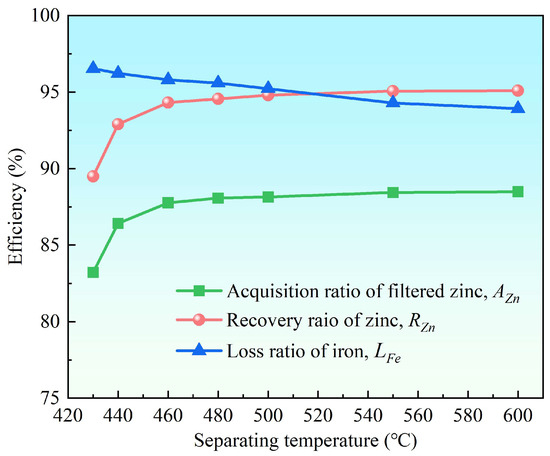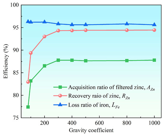 - With the increase in the gravity coefficient and separation temperature, the acquisition ratio AZn and RZn increased. LFe is minimally affected by the gravity coefficient, but decreases significantly as the separation temperature increases. The separation time has little effect on both the filter zinc yield, and the iron removal rate.