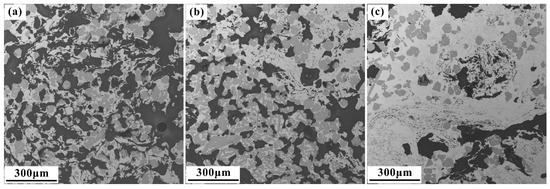 In order to further investigate the phase composition and distribution in the residue, scanning electron microscopy and porosity calculation are performed on the position (A–C) of the residue shown in Figure 7, and the results are presented in Figure 11 and Table 5. It is evident that the top position of the residue contains minimal remaining metal Zn, and the escape of molten Zn leads to the formation of numerous pores between Fe-Al-Zn particles, as depicted in Figure 11a. The porosity at this position is measured to be 53.86% using the ImageJ software. Conversely, the porosity is reduced to 36.31% and the metal matrix is increased, filled with Fe-Al-Zn particles and meandering ZnO, as shown in Figure 11b. The bottom position of the residue (depicted in Figure 11c) contains the highest metal zinc matrix, with the fewest Fe-Al-Zn particles and the lowest porosity at 22.68%.
