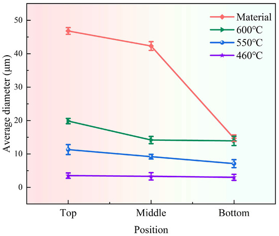 Table 7 and Figure 14 show the average diameter of the inclusions at different positions of the filtered zinc under different temperatures. Compared to the raw material, a significant reduction in the inclusions size was observed in all three positions after super gravity. At the same temperature, the number and size of inclusions in each sample presents a gradient decreasing distribution from top to bottom. The size of the inclusions at the same position diminishes with decreasing temperature, which also coincides with the trend of LFE in Figure 12. When the separation temperature was 550 °C and 600 °C, the inclusions in the upper and middle part decreased from 45 μm to approximately 15 μm. the inclusions in the top and middle position were only approximately 3 μm. Therefore, 460 °C is a more desirable separation temperature.