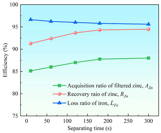 For the separation efficiency, AZn and RZn increased slowly from 85.12% and 91.27% to 88.00% and 94.47%, respectively, as the separation time increased from 10 s to 300 s, while there was a slight decrease in LFe, from 96.63% to 95.60%. In summary, it can be concluded that efficient acquisition ratio of filtered zinc can be achieved in the supergravity field with only 10 s, which proves the efficiency of super gravity technology is efficient in enhancing multiphase separation.