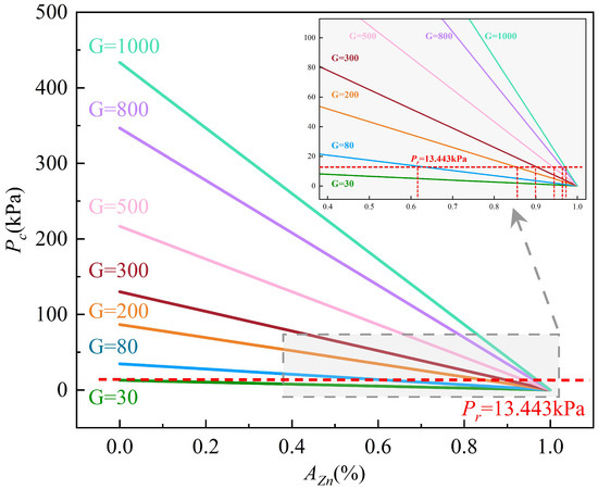 In order to complete the solid–liquid separation of the impurities from the hot-dip galvanizing slag, the centrifugal pressure Pc on the zinc liquid needs to be higher than Pr of 13.443 kPa (calculated by the Formula (7)). As the separation proceeds, the amount of hot-dip galvanizing slag above the CFF decreases, lowering the Pc. The variation in the residue in the upper part of the crucible in relation to the Pc at different gravity coefficients is illustrated in Figure 19. When the gravity coefficient is greater than 80, the zinc liquid can flow through the graphite carbon felt. As the separation proceeds, the remaining amount of zinc liquid in the upper part of the graphite carbon felt also decreases. When the centrifugal pressure on the residue is less than 13.443 kPa, the zinc liquid cannot pass through the graphite carbon felt. The theoretical percentages of the residue and filtered zinc at different gravity coefficients are listed in Table 9. The proportion of residue becomes smaller as the gravity coefficient increases, while the percentage of filtered zinc becomes larger. With the increase of the gravity coefficient from 50 to 300, the amount of residue drops steeply from 100% to 17% while the percentage of filtered zinc increased sharply from 0 to 83%. With increasing gravity factor to 800, the amount of residue in the upper part of the carbon felt continues to decrease slowly to 6%, while the percentage of filtered zinc gradually increases to 94%. It is apparent that the larger the gravity coefficient, the better the supergravity separation of hot-dip galvanizing slag, which echoes the previous conclusion.