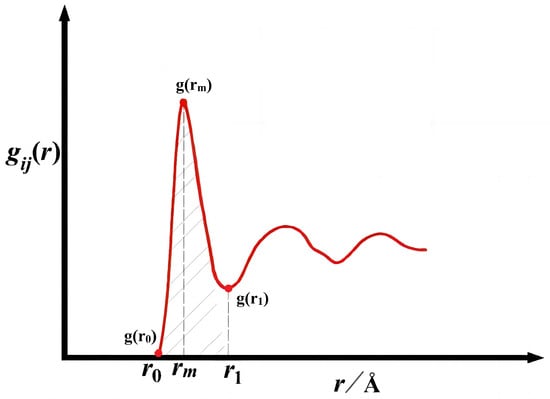 The partial radial distribution function is a function that describes the distribution state of matter and is used to describe the distribution of particles in space. It is defined as the product of the probability of a particle appearing on the unit sphere around a point in space and the density of the particle distribution on the sphere. The partial radial distribution function is an important manifestation of orderliness in the liquid alloy system. The typical partial radial distribution function is shown in Figure 1 [30,31]. Function in the origin of the coordinates near the existence of a clear peak, the first peak can be expressed and the central atom has interaction around the atom distribution changes [32].