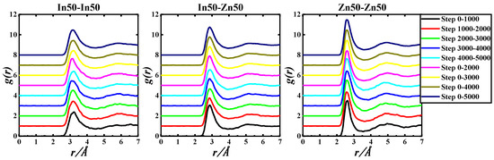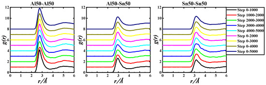 In this work, the simulation uses the AIMD principle. Firstly, the molecular configuration of the alloy cells was established in the Materials Studio simulation software using the Packing method [16]. A total of 118 atoms consisting of 59 Pb atoms and 59 Sn atoms; 126 atoms consisting of 63 Al atoms and 63 Sn atoms; and 122 atoms consisting of 61 In atoms and 61 Zn atoms were simulated by placing them into square cubic boxes with side lengths of 15.5 Å, 15 Å, and 14 Å, respectively. The densities of the three systems of Pb0.5-Sn0.5, Al0.5-Sn0.5, and In0.5-Zn0.5 were 8.632 g/cm3 [25], 4.53 g/cm3 [26], and 6.665 g/cm3, respectively [27]. Next, AIMD simulations based on density functional theory (DFT) were performed using the VASP software [17]. The exchange-correlation function employed the Perdew–Burke–Ernzerhof (PBE) function, which is based on the generalized gradient approximation (GGA) [18]. Ultrasoft pseudopotentials [19] were used. The cutoff energy is chosen to be 1.3 times higher than the maximum cutoff energy provided in the pseudopotential files [17], and the calculation accuracy was chosen to be 10−4 eV/Å for the electron step and 10−3 eV/Å for the ion step. In simulating the kinetics, the simulation temperatures were set to 1050 K, 973 K, and 730 K, respectively, with the NVT system [20] synthesized using a Nosé–Hoover thermostat for temperature control [28]. The time step was 3 fs and the maximum number of steps for the ion motion was 5000 (15 ps). The K-point is set to the Gamma point [17]. Subsequently, the trajectory file XDATCAR was obtained as an output of the VASP kinetic simulation calculations, which includes the atomic coordinate information output at certain step intervals (i.e., all the atomic coordinate information of the 5000 steps of the performed calculations). Subsequent import into the VMD software allows the direct generation of g(r) images and g(r) coordinate data required for stepwise calculations [29].