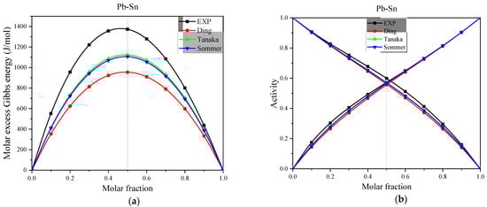 (a) The experimental and calculated values of molar excess Gibbs energy for the full concentration of Pb-Sn alloys in the Miedema model at 1050 K, (b) The experimental and calculated values of activity for the full concentration of Pb-Sn alloys in the Miedema model at 1050 K.