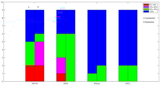 Table 9, Table 10, Table 11, Table 12, Table 13 and Table 14 show the results of stepwise calculations for the three systems using the symmetric and asymmetric methods in the four models, respectively. The ARD comparison images of all the activity distributions calculated for the three binary alloy systems under the asymmetric and symmetric methods are given, where the x-axis represents the four models. The two small bars for each model represent the asymmetric and symmetric methods under each model, the different colors of each bar represent the different ranges of the ARD values, and the scale of the bar is the number of data accounted for by the calculations of the nine sets of distributions, see Figure 8, Figure 9 and Figure 10.