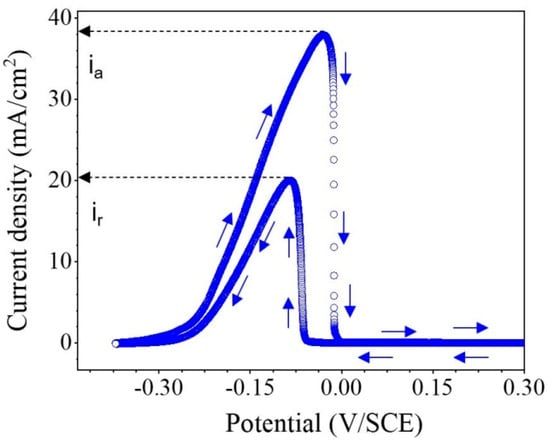 In electrochemical investigations, a VSP300 potentiostat Electrochemical Workstation (BioLogic, Seyssinet-Pariset, France) is employed. Three electrodes are loaded into the test cell: a saturated calomel electrode (SCE) for the reference electrode, a platinum plate for the counter electrode, and a sample for the working electrode. The sample is exposed to solution through a 6 mm diameter circular window in the test cell. Prior to testing, samples must be prepared by grinding with 120- to 1200-grit emery paper, polishing with 0.3 µm alumina powder, and degreasing with acetone. The DOS of heat-treated samples is evaluated at room temperature in a solution of 0.5 M H2SO4 + 0.01 M KSCN using the DL-EPR test method. After 5 min, the sample has been exposed to the test solution, and its open circuit potential becomes stable. Then, the measurement starts by scanning the forward potential from the corrosion potential (Ecorr) to 0.3 V/SCE, then reverses to Ecorr at a scan rate of 60 mV/min until the corrosion potential is reached. The solution used in the test, including other parameters, is recommended in literature to achieve a consistent result [,]. A schematic diagram of the DL-EPR plot is shown in Figure 1. In DOS calculations, activation peak current density (Ia) and reactivation peak current density (Ir) represent the maximum current density during forward and reverse scanning, respectively, and will be used in Equation (1). In addition to DL-EPR measurements, samples are also microstructurally observed and analyzed using SEM with EDS before and after the test.