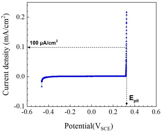 Pitting potential (Epit) is evaluated through flat-cell corrosion testing. This procedure includes a working electrode serving as the test sample, a platinum auxiliary electrode, and a reference electrode represented by the SCE. The test sample is loaded into the test cell, which provides a window 6 mm wide for exposure to solution. Testing is conducted in a solution of 3.5% sodium chloride using potentiodynamic polarization. The process is controlled by an EC-Lab program using a potentiostat model VSP300. A test begins at −150 mV relative to Ecorr and proceeds until a specified potential is reached. The current density was measured up to 200 µA/cm2, with a scan rate of 60 mV/min. The resulting data formed a polarization curve from which an Epit could be determined at a current density of 100 µA/cm2 [,]. Figure 2 shows a schematic representation of the potentiodynamic polarization plot.