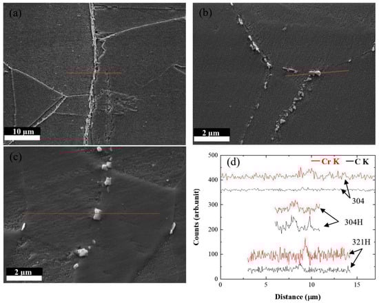 Chromium carbide formation in austenitic stainless steels, AISI 304, AISI 304H, and AISI 321H, was investigated using SEM after immersion in a salt melt for 300 h at 600 °C. To facilitate the detectability of carbide phases, the sample surface was prepared using Glycerigia etchant in accordance with ASTM E407. The SEM images demonstrated the presence of chromium carbide precipitation or traces at the grain boundaries of each stainless steel. This is shown in Figure 3. Figure 3a clearly indicates the formation of chromium carbide precipitates at grain boundaries of AISI 304. For AISI 304H and AISI 321H, discontinuous precipitation of chromium carbide can be detected at higher magnification, as shown in Figure 3b,c. Figure 3d shows an EDS line scan mode showing the concentrations of chromium and carbon across the grain boundary. This reveals that all three grades of stainless steel have the highest concentrations of chromium and carbon elements at this location after exposure to the salt melt for 300 h at 600 °C. This indicates a chromium carbide formation at the grain boundary and results in chromium depletion around the precipitates due to the consumption of chromium and carbon in stainless steel. However, what the evaluation results reveal regarding the susceptibility of IGC remains unclear.