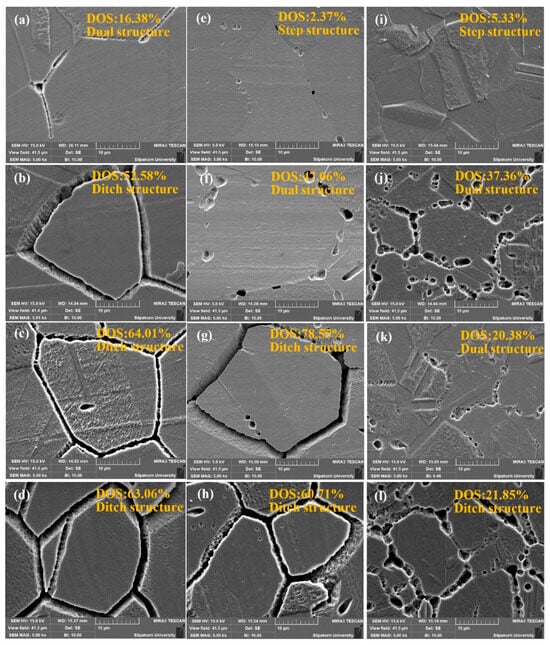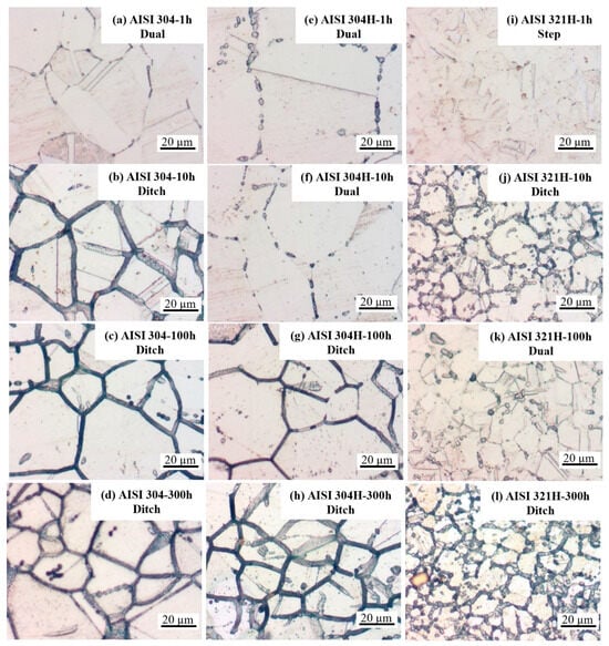 After DL-EPR testing, without additional surface preparation, samples were investigated for surface morphology using SEM. SEM images are not required to show the same results as the oxalic test due to the different methods. However, they do reveal remarkable signs of IGC over grain boundaries because of exposure to molten salt at 600 °C. Figure 7 illustrates this. In ASTM A262-15 practice A, SEM images can also be classified into three types of microstructures: step, dual, and ditch. Based on the microstructures observed in Figure 7a–d, for AISI 304 stainless steel, a dual structure evolves into a ditch structure after immersion for 10 h. Figure 7e–h demonstrate AISI 304H stainless steel microstructures, where a step structure is transformed into a dual and a ditch structure after immersion for 10 and 100 h, respectively. There is a similar evolution of microstructure from step to dual after the exposure of AISI 304H and AISI 321H for 10 h. The recovery of dual structures begins within 100 h, whereas ditch structures appear within 300 h of exposure for AISI 321H (see Figure 7k,l). The appearance of a ditch structure in AISI 304 indicates a higher susceptibility to IGC than in AISI 304H. A ditch structure is shown in Figure 7l for AISI 321H after up to 300 h of exposure. Accordingly, AISI 321H has the highest tolerance for IGC susceptibility of three grades of austenitic stainless steel.