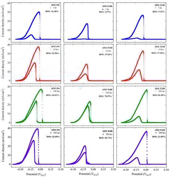 After sensitization in molten nitrate salt at 600 °C for both AISI 304 and AISI 304H, DOS monitored by DL-EPR generally increases with sensitization time. A healing effect, however, can result in a decrease in DOS, as seen in the case of AISI 321H. It is well known that stainless steel sensitization is due to chromium diffusion near the grain boundaries. This allows chromium to combine with carbon and precipitate as chromium carbides, leading to a higher risk of high levels of DOS or IGC [,]. In spite of the fact that chromium diffusion results in chromium depletion at grain boundaries, this depletion can be recovered by extending the sensitization time []. This leads to new passive film layers. Consequently, the Ir decreases, and the DOS value decreases as well. For DL-EPR testing, this phenomenon is called desensitization or the healing effect [,,].