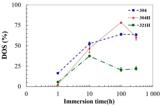 AISI 304: In the first hour, the DOS value is low, approximately 16%. It increased dramatically from 16% to 53% within 10 h of exposure. Within 100 h, DOS reaches 64%, its maximum level. DOS remains high at nearly the same level at 300 h exposure. This agrees with the oxalic test results, which show the evolution of a dual structure to a ditch structure.