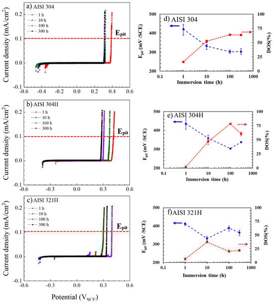 Taji et al. found that sensitization had a significant correlation with pitting corrosion behavior []. In the reverse view, if chromium recovery or the healing effect occurs, passive films will be enhanced, leading to an increase in Epit and a decrease in DOS. Hernández et al. reported the relation between Epit and DOS, where Epit declined as DOS increased []. Therefore, the pitting test was conducted on AISI 304, AISI 304H, and AISI 321H samples exposed to molten salt at 600 °C for up to 300 h. Figure 8a–c show polarization curves of AISI 304, AISI 304H, and AISI 321H, respectively. Likewise, the values of Epit at different exposure times plotted along with DOS assessed by DL-EPR are shown in Figure 8d–f. The data of Epit are also summarized in Table 3. It can be seen that the Epit values of all samples are greater than 400 mV/SCE for one hour of exposure to molten salt. After 10 h of exposure, they decline dramatically. The AISI 304 Epit values monotonically decline with the exposure duration (Figure 8d). It is worth noting that in response to sensitization, Epit declines rapidly within ten hours as a result of carbide precipitates; furthermore, the extended exposure time slows this decline with a healing effect []. In contrast, AISI 304H and AISI 321H exhibit Epit values that increase after sensitization for 100 and 10 h (Figure 8e,f), respectively. For both grades, the chromium content in the chromium-depleted zone also increases, confirming the healing effect due to chromium depletion recovery. Epit values vary with exposure times and exhibit an inverse relationship with DOS. For AISI 304H, after 100 h, exposure to molten salt resulted in DOS and Epit recovery. This result aligns with the self-healing of AISI 304H after annealing at 800 °C in air for 1 h and aging at 750 °C in air for 10 h reported by Abou-Elazm et al. [] and Kannan et al. [], respectively. However, as previously reported, the DOS of AISI 304H after exposure to molten salt at 600 °C is still high. This indicates that chromium recovery is still not fast enough to keep up with carbide formation.