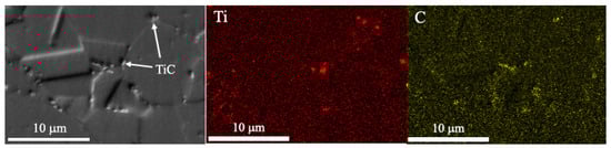 The significant IGC resistance of AISI 321H is often explained by the stabilization due to Ti, which is a carbide-forming element. To confirm this, microstructure analysis was carried out using SEM. The SEM and EDS mapping images of AISI 321H after exposure to molten nitrate salt at 600 °C for 10 h are shown in Figure 9. There are identical bright spots in the Ti and C mapping images where titanium carbide precipitates. The precipitation of titanium carbide can be observed partially at the grain boundary. As reported by Liu et al., there was such a precipitation of titanium carbide in AISI 321 after exposure to molten salt for two hours []. Thorvaldsson et al. reported that when Ti stabilizes, austenitic stainless steel is sensitized at 750 °C in air and chromium carbide dominates, while (Ti,C) is partially present in the carbide phase. (Ti,C) can be detected immediately after 5 min at 750 °C, and the volume fraction of (Ti,C) increases with increased aging time, whereas (Cr,C) phase decreases []. This may be the reason for the dramatic increase in DOS after exposure to molten salt for 10 h of AISI 321H. This is when chromium carbide precipitates dominantly form. Later binding of carbon to Ti results in chromium recovery and the healing effect.