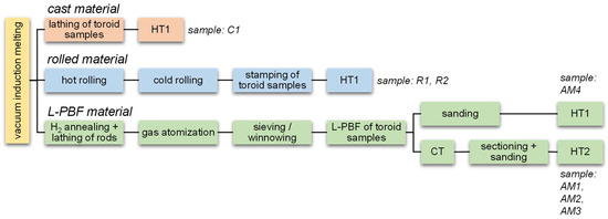 The samples in this study were produced by casting, rolling, and the L-PBF process. An overview of the processing steps for toroid sample production through each type of production method is shown in Figure 1.