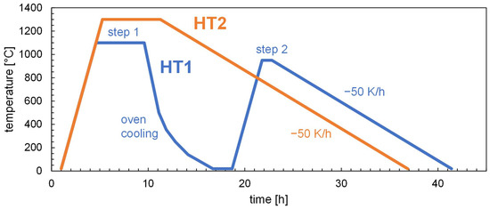 The heat treatment of the cast and rolled materials was carried out using a dry hydrogen atmosphere. The AM samples were heat-treated under argon with an addition of 5% hydrogen. Two different heat treatments (Figure 2) were applied to the samples: (1) a two-step heat treatment derived from the reference materials (HT1) consisting of 4 h at 1100 °C, with cooling in the oven and 1 h at 950 °C, with slow cooling in the oven at −50 K/h until reaching room temperature; (2) an adjusted heat treatment (HT2) for the AM samples consisting of 6 h at 1300 °C with slow cooling in the oven at −50 K/h until reaching room temperature.