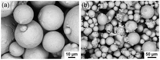 Gas-atomized Fe-12Al powder with a predominantly spherical morphology (a). Some non-spherical particles with satellites and melt splatter adhering to them can be found as well (b).