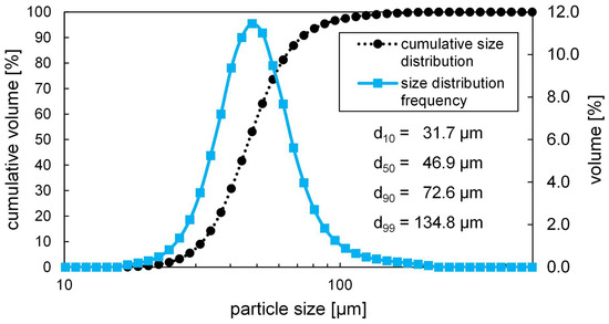 The measured particle size distribution (PSD) in Figure 4 reveals a median diameter of d50 = 46.9 µm.