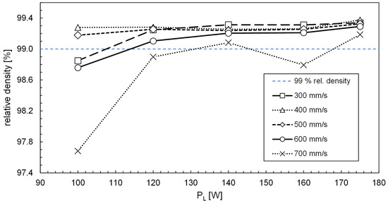Relative density of L-PBF cuboid samples produced under different combinations of processing parameters (laser power, PL: 100, 120, 140, 160, and 175 W; scanning speed, vS: 300, 400, 500, 600, and 700 mm/s).