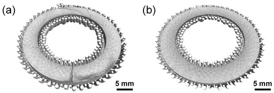 Three-dimensional renders of CT data of the additively manufactured AM4 HT1 ring sample (PL = 160 W, vs = 500 mm/s, h = 90 µm, and d = 20 µm) with applied copper windings for magnetic testing showing several cracks in the core material. Cracks appeared both parallel and perpendicular to the horizontal cutting plane. (a) Three-dimensional render with a virtual cut in the middle of the ring sample revealing cracks. (b) Three-dimensional render with a virtual cut near the bottom of the ring sample revealing a crack-free section with a height of about t = 1 mm.