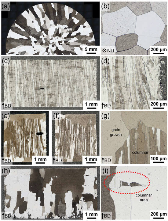 The microstructure (OM, BF, and v2a etchant) of the Fe-12Al alloy after the different manufacturing routes and heat treatment states (AM cuboid samples: PL = 160 W, vs = 500 mm/s, h = 90 µm, and d = 20 µm): (a) cross-section of the cast material ingot prior to heat treatment; 100×; overview image); (b) rolled material after heat treatment (HT1); ND—normal direction; 100×; detail; (c) the AM material in the as-built state; 100×; overview image; (d) the AM material in the as-built state; 100×; detail; (e) the AM material after the first step of heat treatment HT1 with an inhomogeneous grain size; 100×; overview image; (f) the AM material after the completion of HT1, showing no further changes in its grain size; 100×; overview image; (g) the AM material after heat treatment (first step of HT1): border between coarse grown grains and columnar grains; 100×; detail; (h) the AM material after heat treatment HT2; 100×; overview image; (i) the AM material after HT2: area with the remaining columnar grains; 100×; detail.