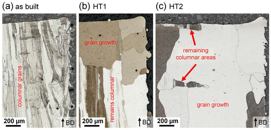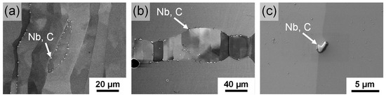 After the adjusted heat treatment HT2 at 1300 °C, the grain growth is more uniform and also affects the core region of the sample (Figure 12c). The difference in microstructure compared to HT1 can be explained by the higher temperature, enabling faster grain growth and a more effective removal of impurities by diffusion. Further, the previously mentioned grain growth-inhibiting non-metallic inclusions are able to go into solution at temperatures ranging from 1250 to 1350 °C [29,30,31]. Therefore, their inhibiting influences on grain growth are circumvented with HT2. During slow cooling, Nb carbides are able to precipitate again and grow preferably on the grain boundaries and other nucleation sites. Precipitates of Nb carbides were also frequently observed near the remaining columnar areas (Figure 9b). However, further investigations are necessary to clarify the relationship between the Nb carbides and the grain growth-inhibiting effect in these remaining areas.