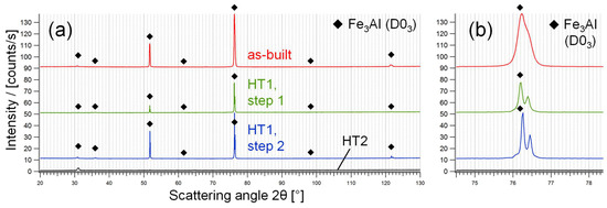 XRD patterns of the L-PBF Fe-12Al cuboid samples in its as-built condition after HT1 heat treatment step 1 (1100 °C, 4 h) and HT1 step 2 (step 1 + 950 °C, 1 h, cooling rate −50 K/h); the expected peak positions of the ordered Fe3Al (D03) phase are indicated with black symbols; (a) the complete spectrums show the best fit with Fe3Al (D03); due to texturing, the peak distribution is different than expected, and some peaks are visible only faintly or not at all; (b) the amplified region shows peak thinning caused by lattice relaxation during the course of the heat treatment and peak splitting due to the two K-alpha spectral lines.
