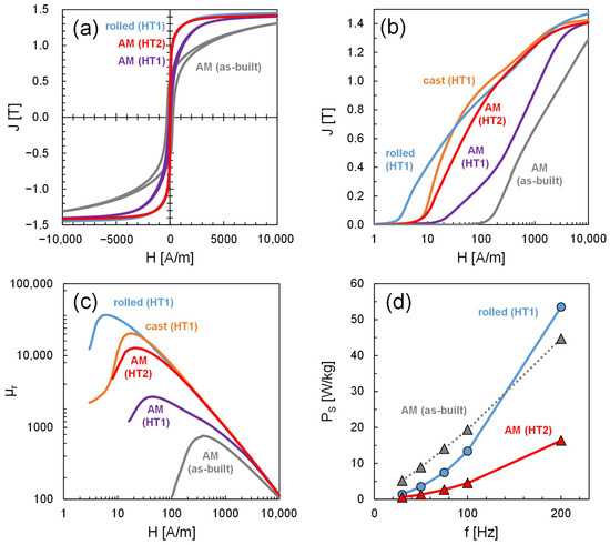A comparison between the AC properties of an AM HT2 sample (AM1) and a rolled sample (R1, HT1), both with t = 1 mm, is shown in Figure 11d. The rolled sample displayed lower losses than the as-built AM sample at frequencies below 100 Hz, but higher losses at 200 Hz. The AM1 sample annealed with HT2 showed the lowest losses during all the tested frequencies.