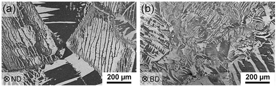 The additively manufactured material in its as-built state (Figure 8c,d) displays a distinctive columnar grain structure with its grains elongated parallel to the BD and a mean grain size of 24 µm. However, individual columnar grains expand over several hundred µm along the BD.