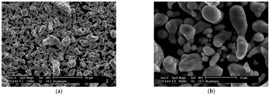 The base metal used for the primary alloy was commercially pure aluminum (Al) manufactured by Alfa Aesar (Haverhill, MA, USA). According to the specifications provided by the company, it has a purity of 99.5% and an average particle size of 44 µm (Figure 1).