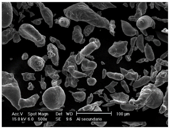 The base metal used to generate secondary aluminum alloys was obtained from recycling aluminum alloys of the 1XXX series. Figure 2 presents an average size and irregular shape of the aluminum powders obtained after the respective recovery process, that is, chip and bulk secondary aluminum melting and subsequent atomization.