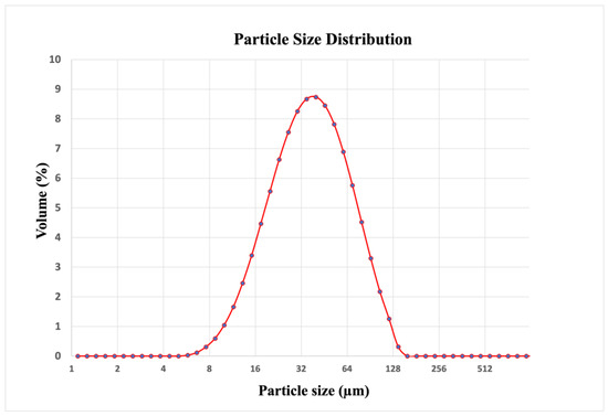 The chemical composition of the recycled aluminum powder is shown in Table 1. Low amounts of oxygen were evidenced (values were not highlighted in the mentioned table). Figure 3 shows the particle size distribution with d50 = 39 µm obtained from a laser particle size distribution analysis carried out with a Mastersizer Malvern Instruments S.L. (Indian Trail, NC, USA). The density of the alloy has been defined by the producer and corresponds to 2701 g/cm3.