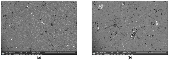 As the sintering temperature is increased to 550 °C (Figure 6), the microporosity in both primary and secondary alloys decrease significantly. The porosity becomes very limited, isolated, and lacks interconnections, well within the standardized limits for this type of material. This increase in densification is expected to positively impact the final mechanical properties. In both materials, the FCC_A2 phase remains the dominant continuous phase in the microstructure. It is noteworthy that despite the elevated sintering temperature, the secondary phase remains stable and exhibits similar percentages in both the primary material (Figure 6a) and recycled material (Figure 6b). However, the morphology of the particles differs, with a finer and more uniform distribution in the material obtained from primary aluminum.