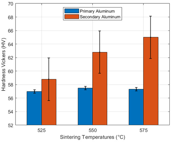 Regarding secondary alloys, the hardness values are higher than those of the primary alloys for each temperature, and their hardness increases with rising sintering temperature. This behavior can be explained by the formation of a secondary iron-based phase, Al13Fe4, which was determined through Thermo-Calc simulation and confirmed via EDS in the microstructural study. Numerous studies have established that the generation of iron-based secondary phases, regardless of their stoichiometry, enhances the stiffness of aluminum alloys [40,41]. Additional results not included in this study allowed for the calculation and determination that the iron-based secondary phases in the secondary alloys reached hardness values of approximately 140 HV. The hardness results highlight the dispersion of results in the secondary alloys, attributed to the presence of dispersed AlxFey secondary phases in the samples.