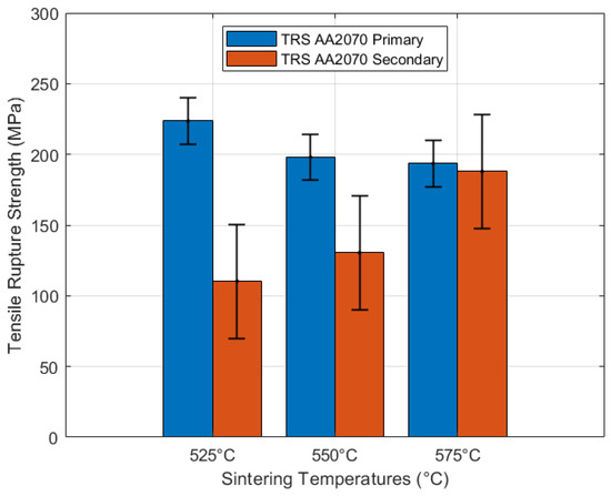 The results of the bending tests, as represented by the transverse rupture strength, exhibit a significant difference behavior for primary and secondary alloys. At 525 °C, the difference is 113.3 MPa, decreasing to 67.61 MPa at 550 °C, and then nearly leveling off at the maximum temperature between the primary and secondary alloy (approximately 5.48 MPa). The primary alloy shows a slight decrease in strength as the sintering temperature increases, while conversely, the secondary alloy AA2070 exhibits an upward trend, with a less pronounced increase between temperatures of 525 °C and 550 °C (approximately 20.58 MPa) and a more pronounced increase between temperatures of 550 °C and 575 °C (approximately 57.52 MPa).