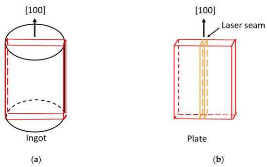 Plates were obtained by cutting the cylindrical ingots (a). The weld joints are parallel to the [100] direction (b).