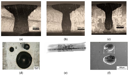 Cross-sections of the L1 welds made with different feed rate V: 17 mm s−1 L1-A (a), 25 mm s−1 L1-B (b) and 33 mm s−1 L1-C (c). The seams exhibit a complete penetration of the plate with the lower feed rates (a,b) whereas it is only partial for V = 33 mm s−1 (c). Porosity observed in samples L1-A (d) and L1-B (e,f). Figure 2e is a radiographic image of sample L1-B.