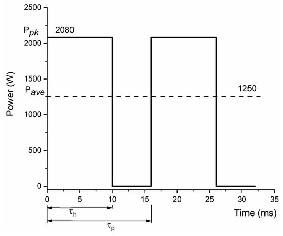 Owing to the significant porosity present in both L1 and L2 joints, these LW procedures give unsatisfactory results. Therefore, for L3 samples, a pulsed laser beam was used to reach a higher instantaneous intensity [30,31,32]. Laser pulses are schematically shown in Figure 4 and the process parameters are reported in Table 2. Ppk = 2080 W, Pave = 1250 W, τh = 10 ms and τp = 16 ms are the maximum and average power, the pulse duration and the time between two successive pulses, respectively. In the experiments, a frequency f = 60 Hz and a duty cycle (DC) of the rectangular beam of ~60% were adopted.