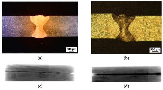 L3 (a) and L4 (b) cross-sections and radiographies of the joints, (c,d) respectively. The weld penetration of the plate is complete and no pores can be observed along the seams.