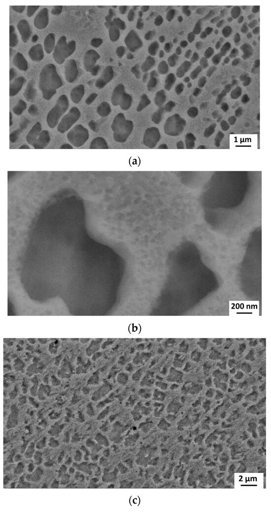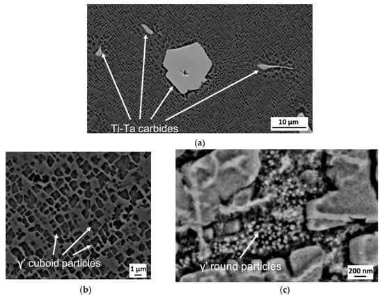 SEM images in Figure 6 show the BM structure in an L3 sample that mainly consists of ordered γ′ phase (dark zones) embedded in the γ matrix (bright zones). Some particles of other compounds with a large size and irregular shape are also observed (a). The total amount of Ti and Ta in these particles exceeds 85 at.%; thus, they have been identified as Ti-Ta carbides [28]. Their morphology depends on the initial solidification rate (~15 mm s−1). According to Sun et al. [37], who studied the carbide precipitation in IN792 DS, Chinese script carbides evolve into faceted carbides when the solidification rate decreases from 50 to 5 mm s−1. In the present case, carbide morphology represents an intermediate stage of this transformation.