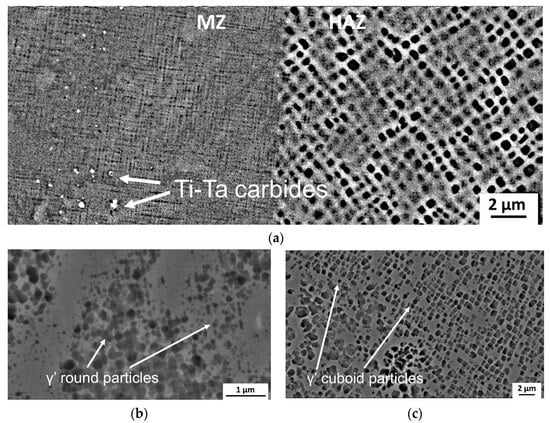 Boundary between MZ and HAZ of a L3 sample (a). The γ′ particles in the MZ are very fine and of rounded shape, (b) while in HAZ, they have a similar size and shape of those in BM (c).