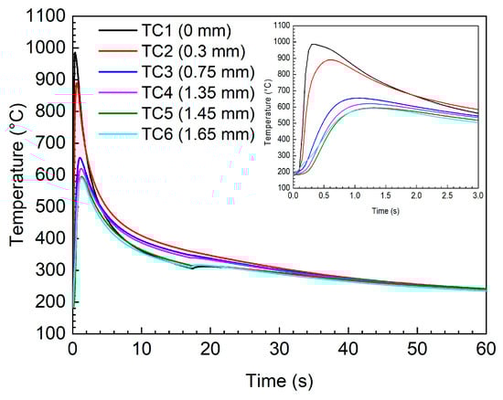 In the welding condition of L3 and L4 samples, the temperature vs. time profiles recorded by the six thermocouples placed at a different distance from the seam border are shown in Figure 9. From the peak temperatures, the value of Q = 1000 W was calculated through Equation (2); the result demonstrates the excellent efficiency of the process. By introducing this value into Equation (1), the temperature reached at any point on the sheet during welding can be determined.