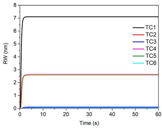 RW(t) curves determined for the six thermal profiles reported in Figure 9 are plotted in Figure 10. They were calculated by integrating Equation (3) with time steps dt of 0.05 s from 0 to t = 600 s: