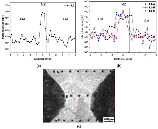 Vickers micro-hardness values measured across the L3 (a) and L4 (b) joints. The hardness peak in (a,b) corresponds to the MZ whose extension is indicated in the figure. In the case of L4 sample (c), the tests were carried out on the top (A), centre (B) and bottom (C) of the seam.