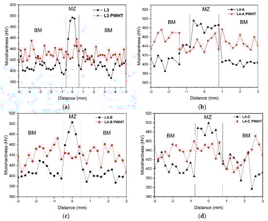 Comparison between Vickers micro-hardness profiles measured across the L3 (a) and L4-A (b), L4-B (c) and L4-C (d) samples, before and after the post-welding heat treatment (PWHT). In all the plots, the hardness peak corresponding to the MZ disappears after PWHT.