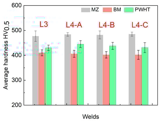 Vickers micro-hardness profiles across the joints of the L3 and L4 samples, before and after PWHT, are reported in Figure 13, while Figure 14 shows the average hardness values in the BM and MZ.