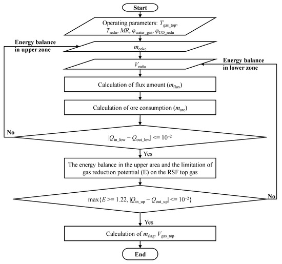 Under the same boundary conditions, the model studies the effects of process parameters such as the temperature of the top gas, MR, water–gas conversion rate, reducing gas temperature, and composition (the ratio of CO:H2). The program calculation flowchart is shown in Figure 2. According to the constraint conditions of the model, the results satisfying the process balance of the whole process under different operation parameters are calculated, and through iterative calculations, the results of the mass and heat balance for the low-temperature and high-temperature zones inside the RSF are obtained.