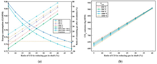 In Figure 3a, it can be observed that as the CO ratio increases in the injected reducing gas (with a corresponding decrease of the H2 ratio), the heat released from carbon oxidation gradually increases, while the heat released from hydrogen oxidation decreases. The total amount of injected reducing gas decreases, resulting in a reduction in the sensible heat brought in by the high-temperature reducing gas, but the total energy consumption increases in the whole process. The research findings indicate that increasing the CO ratio in the injected reducing gas from 5% to 40% leads to a 1% increase in energy consumption, approximately 93.8 MJ/tHM. In other words, for every 1% increase in the CO ratio, energy consumption increases by 2.68 MJ/tHM. The results above are based on hydrogen production from clean energy power generation, which does not produce any carbon emissions. Therefore, the energy consumption of hydrogen production by electrolysis is not considered in the process above, so the influence of different hydrogen production technologies on energy consumption is also one of the restrictive factors to be considered in this new process in the future. Additionally, from Figure 3a, it can be observed that as the temperature of the injected reducing gas increases, there is a slight decrease in total energy consumption, which is due to the increase of sensible heat carried by the reducing gas and leads to the decrease of the amount of reducing gas. Under the condition of satisfying the reduction potential, it will inevitably lead to the increase of the CO utilization rate of the top gas, and then the total energy consumption will be reduced.