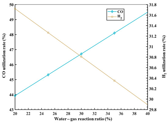 4.3. Effect of Water–Gas Reaction Ratio on Gas Utilization Ratio